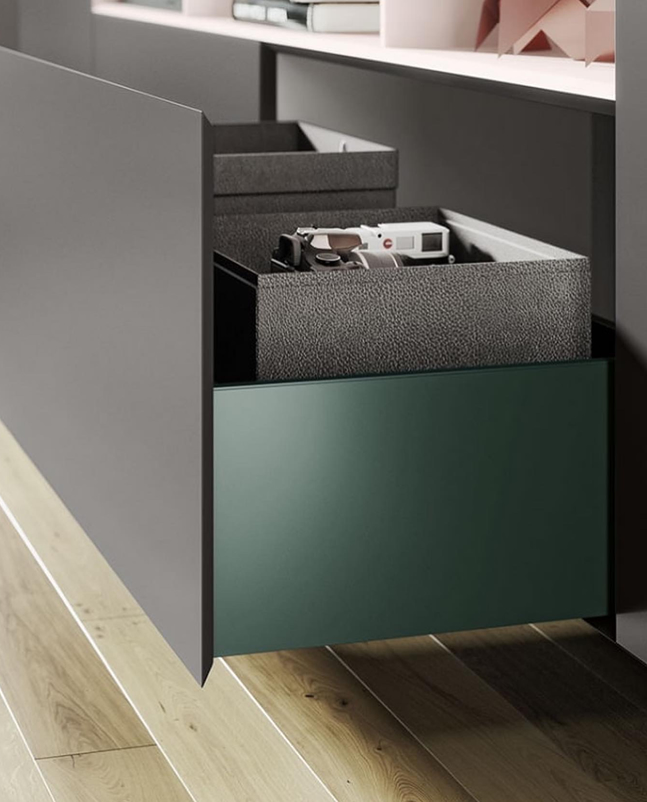 This partnership has led to the creation of an extraordinary product that combines style and functionality. The new drawer cover stands out for a revolutionary clip system that includes two distinct elements: an elegant T-profile coated in aluminum, to be applied to the top of the drawer, and a refined side profile to add a touch of class to each side.